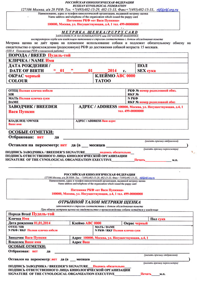 Карина В Мечтах О СОБАКЕ, вот что должно быть написано в щенячке на момент передачи ее покупателю вместе со щенком (красными буквами, персонажи вымышленные). Это основной собакин документ. Ветпаспорт не так важен.