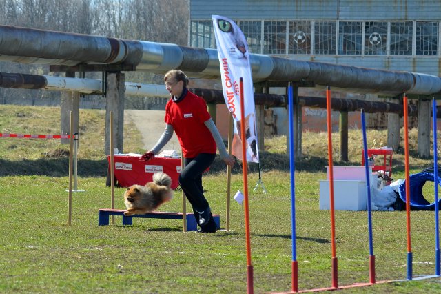 Праздник начался с выступления аджилистов. Как оказалось, первоначально планировалось 2 трассы разной степени сложности, но когда первую (легкую) трассу отбегали, то времени на установку 2-ой уже не оставалось - мероприятие началось не ровно в 10 часов, как планировалось, а позднее, т.к. народу было еще очень мало. В нашей группе была девочка-старшклассница с двумя шпицами. Со старшим она регулярно ходила на занятия, даже на январских соревнованиях в Дзержинске заняла с ним 2-е место, но вчера он что-то не очень удачно выступил, а второй - молоденький - вообще не взял даже 1-ый барьер, все кругами бегал, и они не прошли трассу. Она очень расстроилась, а я потом узнала, что до начала мероприятия на этого шпицика набросился один кобель и потрепал его немного, видно мальчик от стресса еще не отошел... Еще один интересный участник нашей группы - джек рассел терьер. С ним занималась девочка, но она не была его хозяйкой, он часто оставался у них на передержке, а в апреле со своей хозяйкой уехал на ПМЖ в Москву, девочка очень была расстроена - у них установились очень теплые отношения. Каково же было мое удивление, когда приждя утром на стадион я увидела его там весело бегающим, оказалось, что ради соревнования хозяйка нашла время приехать в Чебоксары. Про этого песика хочется немного рассказать. На первых занятиях он был совершенно безудержным и неуправляемым - настоящий терьер. Но регулярные занятия, упорство и старания девочки, а также полезный опыт посещения мастер-классов сделали свое дело - он стал следить за движениями рук своей наставницы, слушать и слышать! ее команды. Вчера он, конечно, выступил не очень удачно, но для нас были очень заметны его успехи в этом виде дрессировки. Последний кадр очень интересным получился... |