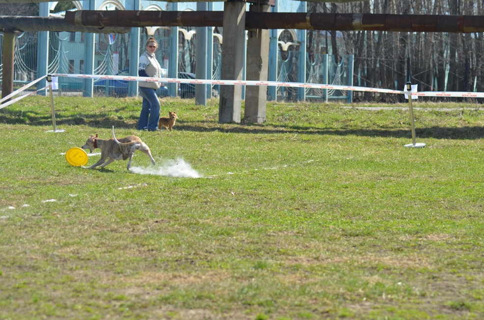 После аджилити были показательные выступления по дог-фризби. Я сама его как-то проглядела, занимаясь другими делами, только потом на форуме снимки посмотрела. Из-за сильного ветра летящие диски собакам ловить было трудно, поэтому в основном им катали роллы. Очень эффектны были борзые уиппеты - грациозные, стремительные, прыгучие, ловучие... Участвовал даже мастино - неторопливо для других, но очень быстро для себя, он целеустремленно двигался к цели и успешно ее достигал! Практически все аджилисты показали себя во фризби... кроме нас с Мэги. Но мы это упущение собираемся наверстать и уже заказали себе диск, который должны привезти наши собачники, выезжающие на выставку в Казань 9 мая. |