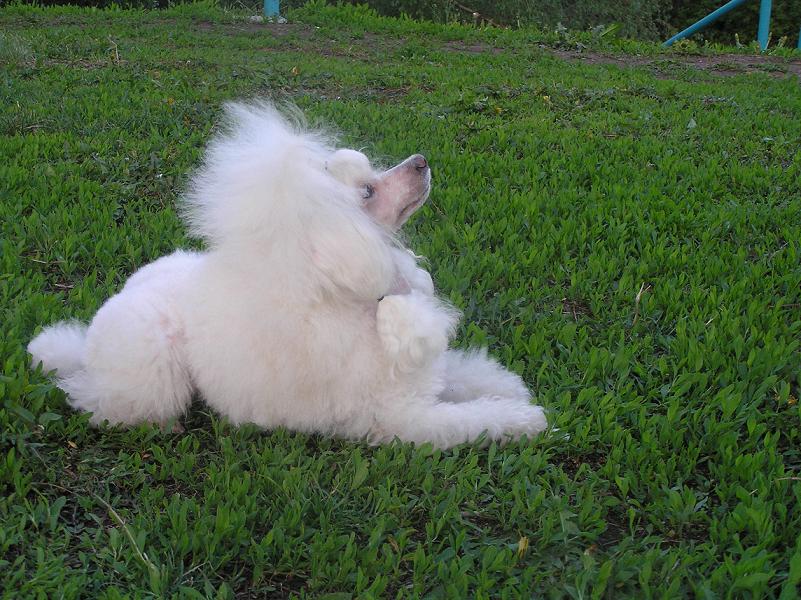 У нас сейчас идет отработка послушки в условиях города - то есть до дороги метров 30-50, люди вокруг... Иногда приходится и в комбинезончике все это делать - тогда вообще все только и спрашивают "неужели пудель может слушаться"? Отрабатываемые упражнения - хождение рядом без поводка, сидеть-лежать-стоять, выдержка на месте, прыжки через ногу, змейка, подача лапы... Вообщем все простенькое, но на публику производит впечатление. К сожалению, почти нет фот, так как работать собаку и одновременно фотать практически невозможно. Вот такие мы, и умные и красивые Команда "лежать". Хорошо лежим, ровненько :) |