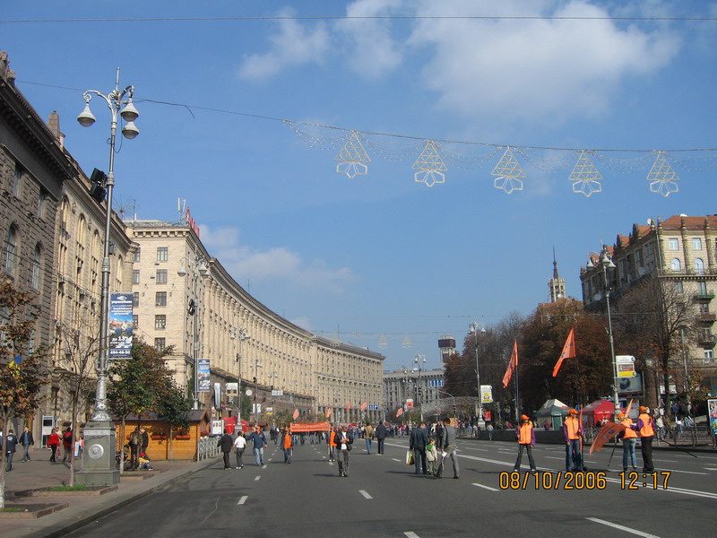 далее, тоже Крещатик, но с другой стороны. Это одна из многих демонстраций во время празднования 14 октября годовщины основания Украинской повстанческой армии (УПА). Вдали видны коммунисты, выступающие против проведения шествия ветеранов УПА.