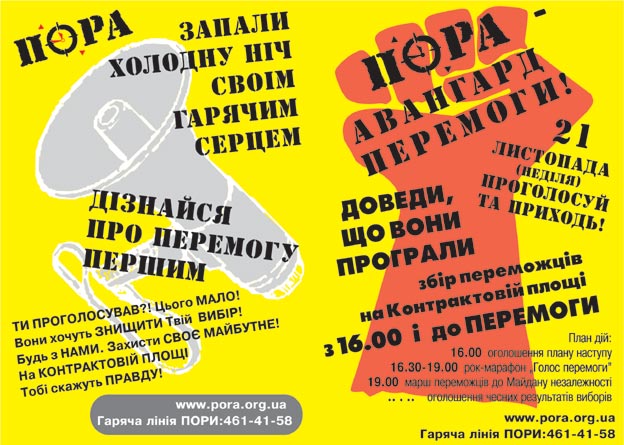 М А Н І Ф Е С Т тих чия пора вже настала пора вірити, пора жити, пора … Пора - це початок. Початок нової України. України нових сподівань, правди і свободи. Пора народила Хвилю. Хвилю Свободи яка змиє бруд, яка очистить душу України. Пора настала в серці Європи. Навесні 2004 року. Коли прийшов судний день української демократії. Пора прийшла в час, коли влада вже не належить народу. Ми не маємо вибору. Ми втрачаєм свободу. Нас пробудила Мукачівська ганьба. А ми розбудимо український народ. Бо ми знаємо, що свобода - це найвища цінність, яку треба захищати. Ми кажемо - далі чекати не можна. Бо це смерть наших ідеалів, сподівань і правди. Далі - зрада батьків і Батьківщини. Ми пройшли вже шлях боротьби. Ми боролися за правду і раніше... Тому постала Пора. Пора випростатися або впасти. Вірити чи забути. Любити і ненавидіти. Боротися чи зрадити. Пора боротися за ідеали, а не за політиків. Пора людей, які готові до подвигу Крут, але здобудуть свою перемогу. Для тих, хто сьогодні каже Пора, вже немає страху. Наша зброя - це правда. Наш принцип - це рівність можливостей. Наша віра - це свобода. Наш ідеал - це справедливість. Пора піднімає Хвилю. Хвилю Свободи від Мукачева до Луганська. Від Маріуполя до Ковеля. Від Севастополя до Ромнів. Пора повірити в Україну. пора діяти, пора боротися, пора перемагати !!! _______________________________________