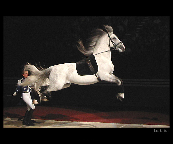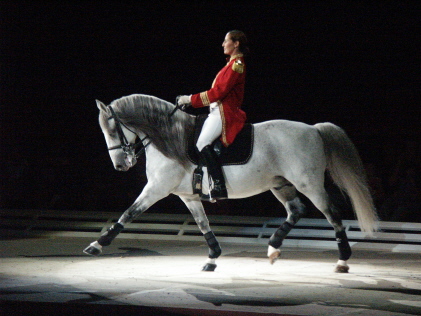 "Испанский" манеж построен в Вене еще императором Максимилианом II в 1572 году. Традиция публичных представлений появилась в Испанской высшей школе верховой езды в 1920 году. Школа дает спектакли три раза в неделю, с марта по декабрь, в основном по выходным. В июле-августе перерыв — у лошадей каникулы, кроме того, школа может уехать на гастроли, О том, насколько это зрелище популярно среди зрителей, говорит тот факт, что билеты рекомендуется заказывать заранее, так как сидячие места раскупаются за не сколько недель до представления. Помимо спектаклем можно попасть и на "утрем нюю работу" — показатель ные тренировки, где все к же элементы верховой езды исполняются без музыкального сопровождения, и можно увидеть работу молодых жеребцов, пока не задействованных в спектаклях. Вся деятельность школы сведена к пышным театрализованным представлениям. Венская школа укомплектована исключительно жеребцами липицианской породы. Под звуки классической музыки появляется смена всадников на белоснежных липицианских жеребцах и начинается красивый спектакль. Берейторы демонстрируют элементы высшей сложности: пиаффе, пассажи, пируэты, перемены ног на галопе, работу лошадей 'в руках", школьные прыжки, работу лошади на длинных поводьях (лонжах) без всадника, большую школьную кадриль и па-де-де. Конечно, "высший пилотаж" — школьные прыжки. Лошади для этой цели должны быть отобраны не только по своим физическим данным, но и отличаться своими природными способностями к школьным прыжкам. Считается, что жеребцы липицианской породы наиболее способны к этому упражнению. Школьные прыжки — исключительное по своей красоте зрелище. Они требуют большого искусства в подготовке лошади и смелости всадника. Во время выполнения школьных прыжков, к которым относится курбет, лансада, баллотада и каприоль, лошадь отделяется от земли всеми четырьмя конечностями. Курбет — школьный прыжок, при котором лошадь, стоя на задних ногах и с поднятыми над землей передними ногами, делает прыжок вверх и вперед и приземляется на задние ноги. Лансада — прыжок лошади вперед на передние ноги с хорошо согнутых задних ног. Так иногда поступают норовистые лошади, желая вырвать повод или сбить всадника. Круппада — положение лошади, как при курбете, но после прыжка с задних ног лошадь приземляется на то же самое место и на передние ноги, Баллотада отличается от круп-пады только положением задних ног. В круппаде, находясь в воздухе, лошадь все четыре ноги держит поднятыми к животу, в баллотаае задние ноги более разогнуты, лошадь как бы показывает свои подковы и, приземлившись на все четыре ноги, переходит в пиаффе. Каприоль — этот прыжок часто называют оленьим. Лошадь, стоя на задних ногах, стремительно и сильно отталкивается от земли вверх и вперед. Это самый эффектный и самый трудный школьный прыжок. Посадка всадника должна быть очень прочной: лошадь при отталкивании и отбивании задними ногами создает сильные толчки, выбивающие из седла (у седла при выполнении каприоля отстегиваются стремена). Традиционная униформа образца XVIII века как нельзя лучше соответствует обстановке и самому спектаклю: шляпы-"треуголки", темно-коричневые сюртуки и ботфорты у всадников, витые мундштуки и раззолоченные оголовья у лошадей. За гармонией и легкостью, с которой исполняются сложнейшие элементы, ст