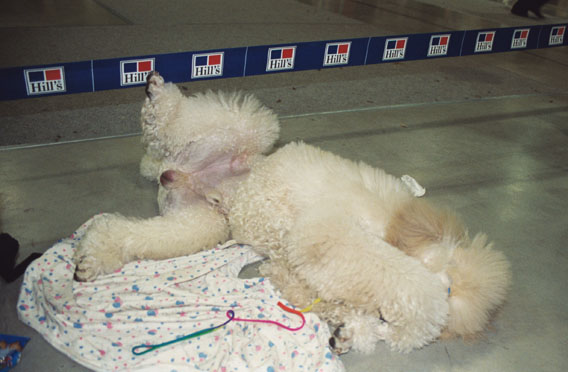 На самом деле этому заср... пардон, пуделю... стыдно не бывает и быть не может. Поскольку для стыда нужна совесть, а он ее в принципе не имеет. Это он просто от света прикрывает лапкой глазки. А то достали тут, понимаешь, выставками - поспать не дадут! (ну а если совсем честно, то он по команде такие трюки делает :)) Большая-большая, белая и пушистая благодарность ulyayar , которая в первый день выставки присматривала за моим балбесом!