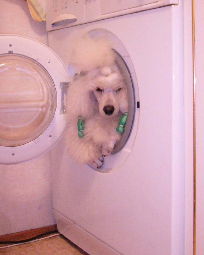 Однажды вечером одна белая любопытная пуделишка сделала большое открытие - она открыла стиральную машину (хотя до этого спокойно жила, три года не проявляя к ней никакого интереса). Вот что из этого получилось.