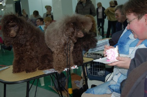 Да, только тоев, потому как кроме десяти стандартов все остальные 80 собак были тоями :) Кстати, интересно, у них в каталоге монопородки есть показательный класс, если так можно назвать. Там записано 11 собак, все чемпионы, но они все не выставлялись. Я не поняла, что это и мы спросили грумёршу, где эти собаки. Она ответила - это реклама, по сути, собак как бы пишут на выставку, но в ринг не выводят. Просто напоминание всем, что есть такие собаки. :) Таким образом, на выставку была зарегистрирована 101 собака, из них 11 - "рекламный" класс, 10 - стандарты, 80 - тои. В основном белые, немного чёрных, чуточку коричневых и серебра. Абрикосовых и красных собак небыло вообще. Ну, кроме одного стандарта :) _______________________________________