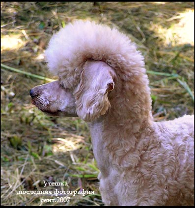 Если бы вы знали - какая это была необычная собака.... ...Её вернули через несколько дней владения "хххх..озяева" : "Мы поняли, что с тоем не справимся. Очень уж маленькая собака! Слишком хрупкая!" В тот год почти одновременно у нас родились два помета - "Т" (6 мини) и "У" (1 мини, 2 тоя). Сука-той была всего одна и уже на следующий день после возврата за Утешкой собирались приехать другие новые владельцы. Тешка была немного грустная, не очень хотела играть и почти не выходила из гнезда. Кушала она хорошо, глазки-ушки чистые - и я решила, что ребенок просто устал. Но, на всякий случай снизила цену. Через два дня Тешу опять привезли обратно. Оказалось, что она постоянно писается (это в куче щенков я не успела заметить) и за двое суток не покакала ни разу. Хозяева в жутких слезах. Теша в специально сшитых крохотульных трусиках с прокладочкой.... ........ опускаю подробности............ Врачи определили у щенка: 1.Трещину крестца, предположительно с нарушением целостности нерва, 2. Деформацию позвонков хвоста в двух местах, 3. Оторван от основания сустав 4-го пальца на задней левой лапе (удерживается кожей), 4. Возможно, косая трещина левого бедра (или вмятина на кости, не определить точно - слишком мал возраст и размер). Совет врачей:"Лучше усыпить. Больше мы ничем не поможем. Да, и вряд-ли она вообще выживет". Вернулся из командировки ветврач, который обычно наблюдал моих собак (В.Хромов). Предположения о травмах подтвердил. Сказал, что все похоже на результат сдавливания, а не удара. (Он опытный врач в этих вопросах - долго проработал с животными в Московском Зоопарке и в Цирке на Вернадского). Он сказал, что усыпить всегда можно успеть, девчонка крепенькая и есть все шансы, что она примерно через год-два начнет контролировать мочу. А пока пусть поживет в трусиках. Прямую кишку посоветовал стимулировать снаружи потому, что сигналы от внутренних рецепторов не доходят до головного мозга (так же, как и от мочевого пузыря). Он сказал, что и с прямой кишкой постепенно тоже всё должно наладиться потому, что нервные сигналы найдут "обходные пути". Тешка осталась у нас. Те хозяева, которые рыдая вернули ее в белоснежных трусиках с прокладочками, получили взамен другую собаку за символическую цену. Девочка росла и становилась красавицей.. Она почти не хромала. Оторванный пальчик болтался на месте, но он не вырос, а поэтому не мешал ей бегать. К писанью и каканью мы приладились. Жизнь налаживалась.... Когда ей исполнилось 10 месяцев я подстригла ее в "Льва". И красиво, и соблюдать чистоту легче. Дело было на даче... Через несколько дней (вечером в пятницу) ее украли. Два дня я прочесывала вместе с большой белой пуделицей Душенькой все окресные леса и поля надеясь найти Тешку хоть живой, хоть... Душка умела хорошо искать. Но мы ничего не нашли. Однако, Душенька натолкнула меня на мысль, где именно надо искать (или ждать) Тешку. Она упорно вела меня на развилку дороги за нашей деревней. Упорно. Я нарисовала большой плакат - пудель в прическе "Лев", рыжий пудель. Крупно написала:"Она пропала! Кто видел - помогите!" Настала следующая пятница - народ потянулся на дачи, а я к 5 часам вечера уже стояла на развилке с этим плакатом. Всю субботу стояла.... Воскресенье... Наконец две женщины сообщают, что у них в дачном товариществе в 8 км отсюда очень похожая собака жила то в одном дворе, то в другом. ......... пропущу подробн