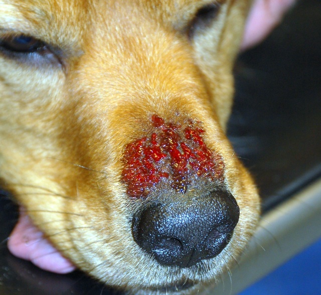 Natascha PP, похоже на химический ожог. Он никуда не мог носом ткнуться на прогулке или в гараже, например? Достаточно антифриза капельки на нос попасть из-под днища автомобиля.....