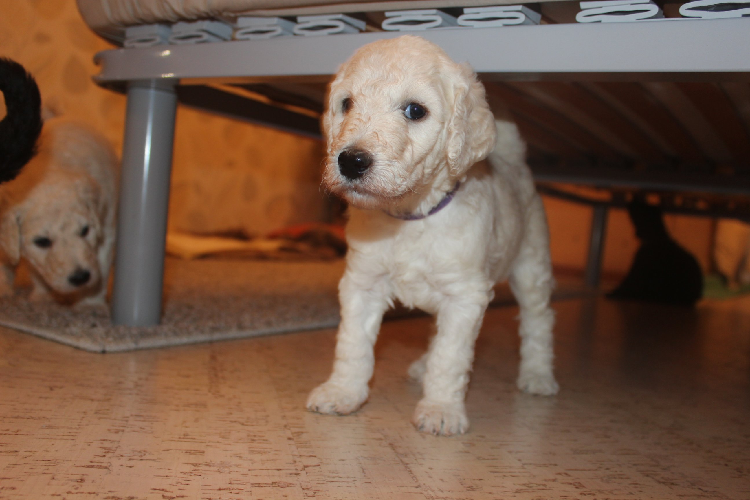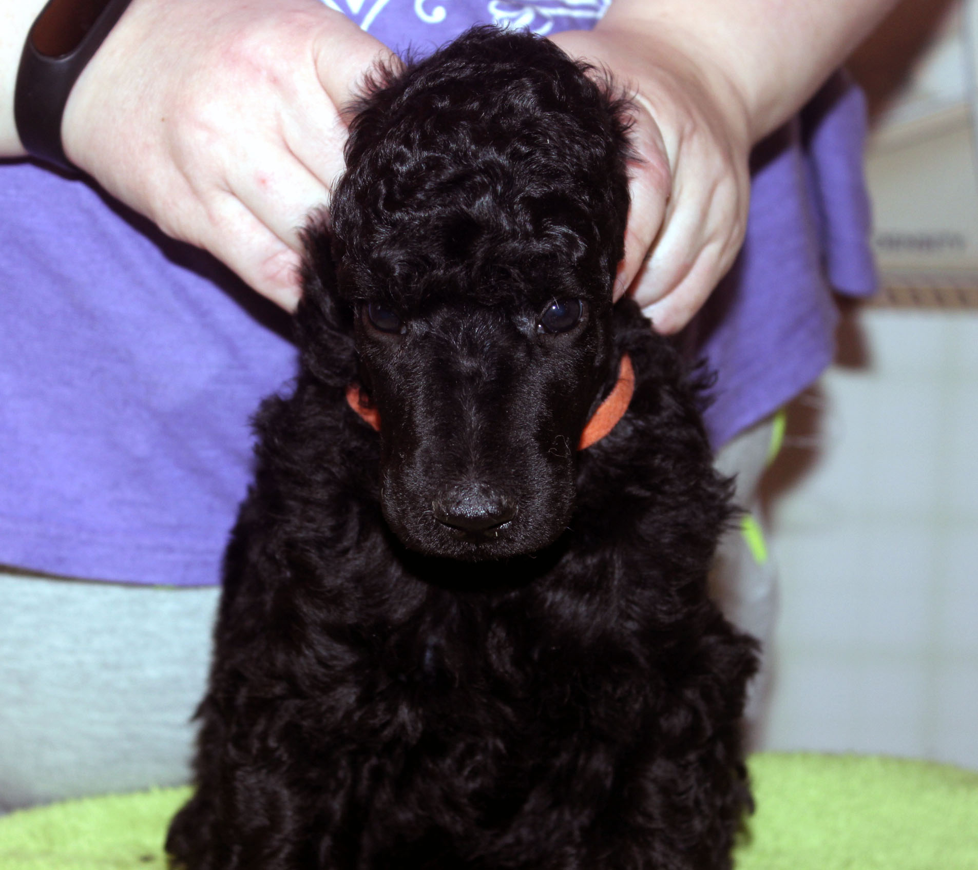 Уважаемые собаководы, вашему вниманию представляется следующая девчушка из отряда щенят-пуделят: Чилли (Chilly Pepper, оранжевая лента). Резвая и активная, сама не лезет в щенячьи конфликты, но легко может за себя постоять. И продолжает хитрить: её любимая игра-спрятаться где-нибудь, распластаться по полу (как будто её никто не видит) и тихо лежать, чтобы атаковать мимопроходящего щенка, или пелёнку, или хвост.. В этом вся наша Чилли. Конечно, она может покорять ринги конкурсов красоты, но большее её привлекают активные игры, аджилити так и манит её.