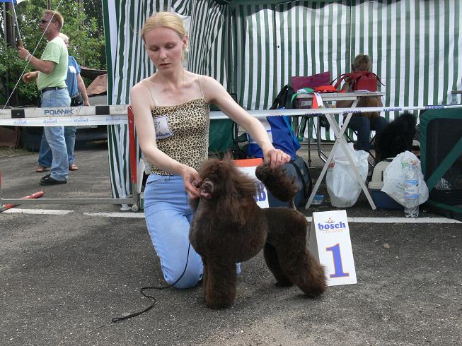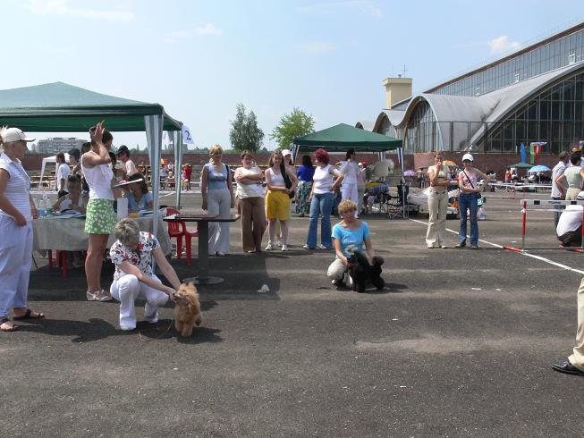 Ну что, начнем: Доехали до Минска на автобусе маленькой пуделиной группой: я с Никушей, Наташа с Глашуней и Ланкой, Ирина Подвысоцкая с абрикосовыми девочками: карликовой ELENSIS ESTEL и тойкой STILL RUSI OT KUTJUR HILDA Температура в Минске была аховая - до асфальта (точнее асфальтовая черная крошка) на стадионе, где проходила выставка - дотронуться было невозможно. Температура на солнце - 51* благо - взяли с собой шатер и спрятались от этого солнцепека, чуть позже к нам присоединились Татьяна Королева и ее знакомые. Долго ждали пока пройдут мопсы, которых было просто невероятное количество, ринг задержался почи на 1,5 часа. И наконец-то пудели начали выходить в ринг - вот тут началось самое страшное: это был не асфальт, а раскаленная сковородка, а эксперт, как-будто нарочно, затягивал экспертизу, наблюдая как пудели задирают лапы в стойке и скачут при движении. Особенно долго проходили сравнительные ринги - эксперт проверял собак и их хозяев на прочность - кто дольше выдержит. Но, пройдя эту экзекуцию, все наши девочки заслуженно получили свои титулы: Ника - CAC, CACIB, Чемпион Белоруссии, ВОВ Дольче Вита из ЧБК - CAC, CACIB, Чемпион Белоруссии, BOS Вива Виктория из ЧБК - ЮСАС, Лучший юниор, Юный Чемпион Белоруссии Наташа и Надежда - от всей души поздравляю Вас с прекрасными результатами ваших девчонок. Наташа - с закрытием Интера В том числе мои поздравления Надежде и Галине Алексеевой с маленькой Масяней SLAVJANKA CHERNAYA ZHEMCHUZHINA SEXTRY - CAC, CACIB, Чемпион Белоруссии, ВОВ Надежда, а тебя еще и с великолепным результатом JUTANA ALDARON - CAC, CACIB, Чемпион Белоруссии, ВОВ Мне кажется он единственный стоял как вкопанный в ринге. карликовая абрикосовая ELENSIS ESTEL - CAC, CACIB, Чемпион Белоруссии, ВОВ той абрикосовая STILL RUSI OT KUTJUR HILDA - CAC, Чемпион Белоруссии Ирины Подвысоцкой Иринка! Поздравляю тебя также с закрытием Эстель интерчемпиона и получением чемпиона Белоруссии малышкой Хильдой. Но самое интересное началось в бестах: 4 место в расстановке в Бесте юниоров стала Вива Виктория из ЧБК - прекрасный результат, если учесть количество претендентов. в 9 группе - из более 20 собак в первом отборе были оставлены пудели всех разновидностей, бишон и к сожалению не помню породу, кажется мопс. После дополнительного осмотра эксперт оставила в ринге пятерых: 1 место - великолепный белый большой KOROL LYUDOVIK ZIRKA ANTARES 2 место - Бишон , 3 место - JUTANA ALDARON 4 место - мопс 5 место - Ника (NIKOL` SUNNY GIRL) сравнение на ВОВ карликов современного окраса SOIGNES ROMEO - BOS CAC CACIB Чемпион белоруссии ELENSIS ESTEL - ВОВ