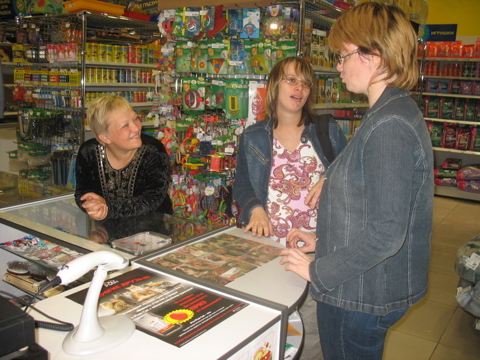 Слева направо: Эля Лепихина, хозяйка Ирис из КХ, я с девятимесячной беременностью, Юля Иванова - моя заводчица:) Где мы? Конечно, в зоомагазине! |