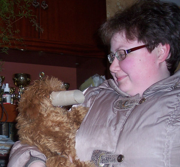 Любимая игрушка у Беси - это картонная трубочка из-под туалетной бумаги. Вот так она с ней ходит по квартире.