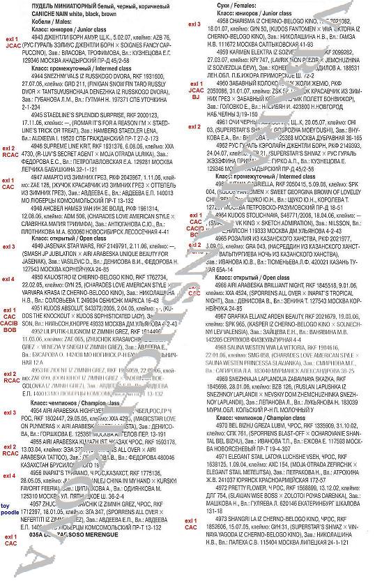 . Нинсанна, в миниатюре кобели открытый класс 4954 Airi Arabeska HIGHFLIYER-3 (так его кличка пишется), Inapat`s TERRANO 4. Суки открытый класс 4966 Airi Arabeska BRILLIANT NIGHT СW, CAC. Свой фотоаппарат даже не достала из сумки ...Повешу пару фоток Jasenak Star Wаrs после стрижки к Евразии. Жаль, что послушала Наташу (совладельца) и записала во взрослый класс, не готов еще мальчишка. В юниоры или в интермедия в самый раз. Только из юниоров вышел. Оба дня был 3 в классе. _______________________________________