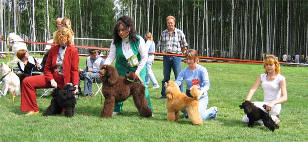 В воскресенье мы приехали на выставку и узнали, что мы зарегистрированы совершенно по другой цене, ладно, доплатили. Затем посмотрев каталог и поняв, что там все ужасно напутано, стали ждать своего ринга. И вот тут начинается самое ужасное. Т.к. практически все собаки и классы были перепутаны( пример: мой Зяма Кл. чемпионов №1050, за ним по каталогу промеж. Класс Суперстар Шиваз №1051, за ним снова Кл.чемпионов №1052 Оливер с Таинственного Острова. Некоторые собаки были записаны в другие разновидности.), Ринговая бригада вызывала в ринг только по номерам, и поэтому описав Зяму мы ждали когда опишут Шиваза , и снова выходили на сравнение уже с чемпионом. Бедная Марит Сунде, она была в курсе этой неразберихи. Она мне сказала «это сумашедший дом». Ринговая бригада только на всех кричала и говорила, что все пойдут как в каталоге написано. Причем экспоненты, люди не глупые и не первый раз на выставках, готовы были выстроиться как положено. О судействе. Было много оч.хор и отл. без титула. Мне повезло мои собаки очень понравились Марит Сунде. Результаты в которых я уверена. Карлики классика. Славян Триумфатор- CACIB, BOB.(чемпионов) Суперстар Шиваз- отл. RCACIB (промежуточный) Оливер с Таинственного острова- отл.2.(чемпионов) Ерофей из Казанского Ханства- незнаю что получил, на сравнение не был. (промежуточный) Чародей из Коллекции России-отл. САСЮ.(юниор) В суках была только белый щенок и ветеранка Хеппилона, которая и выиграла бест ветеранов 2-го дня. В карликах современного окраса единственная собака которая получила титул была моя Небесная Ласточка у неё САС, CACIB, BOB, ЧРКФ.(чемпионов). На резерв никто не был вызван, кобелям тоже САСIB не был присвоен. А там были: Кобели : Солнечный Лев Глинтвейн Бибилотт-щенок Делисс Серпантин Умбриэль-юниор Солнечный Лев Апрель-чемпионов Суки: Промежуточный : Мэджик Мистерии Зингара Зендели-получила отл. Соната Лунной Ночи из Града Катерины-….. Открытый: Боюсь ошибиться, собака записана в малых была, но кажется Лесная Красотка из Сибирской Сказки-отл. Чемпионов Небесная Ласточка. САС, CACIB, BOB, ЧРКФ По малым результаты не знаю. Видела Колибри с Цветочной Поляны, такая красивая, не крупная, просто прелесть, но на бесте юниоров я её не видела. В тоях САС, CACIB, BOB, ЧРКФ получила очень красивая серебристая Джентли Бон Дива Дивная.(чемпионов) с ней в классе была Нетели Глория Стар В промежуточном Солнечный Лев Британь. Кобели : Щенок- Серебряное Руно Капитошка Промежуточный- Бантик Золотистый Франтик. Большие пудели: Абрикосовая Королевская особа из В.С была одна САС, CACIB, BOB, ЧРКФ.(открытый). Классический окрас: Коза Ностра- ЮСАС, в сравнении на лучшую суку была 2-я и RCACIB, но ринговая бригада опомнилась и вспомнила что мы только 9-мес. Юниорки и RCACIB отдали 3-й в расстановке Денвик ХипХоп Ангел(Манник , она Данькина сестра), у неё просто отпадная голова. САС, CACIB, BOB, ЧРКФ, BIG, RBIS Радослава из Б.Р. В кобелях был один Жемчужина Сибири Лидер САС, CACIB, ЧРКФ Бальзам на душу описание моей Марфы « Очень красивая, прекрасная голова и выражение. Хороший корпус. Достаточные углы передних конечностей(практически у всех собак эти углы были или плохие или не достаточные, отнесем это на неточности перевода). Идеальные совершенно движения. Хорошая шерсть» И Зямино описание: «Очень красивого типа прекрасная голова. Мужественное выражение. Очень хороший корпус, Хорошие угл