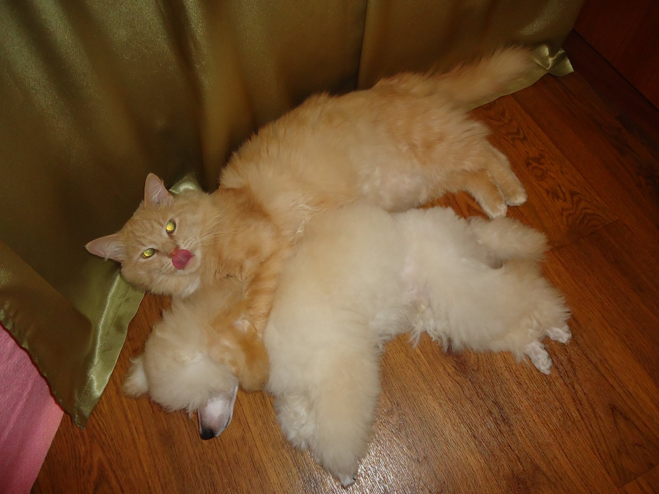 Наш любимый котик Яша , спит с детками , он заменил нам папочку ухаживая за нашими малышами.