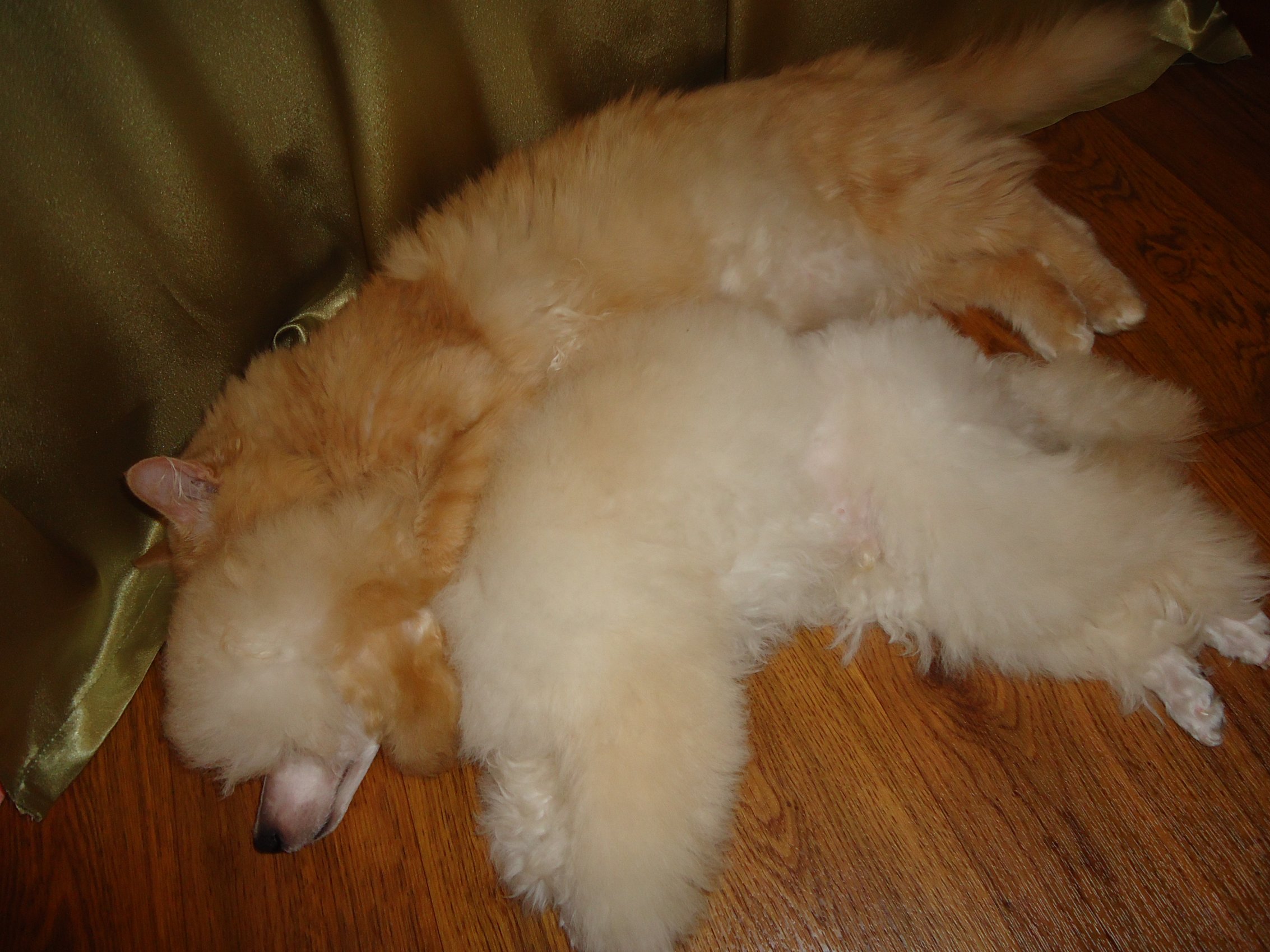мон ренессанс, а беленький-Вельвет постарше,он знает, если Мурзу по шляпе дадут,то ему не достанется, а если шашлык ,то и ему дадут,чтобы не обидеть