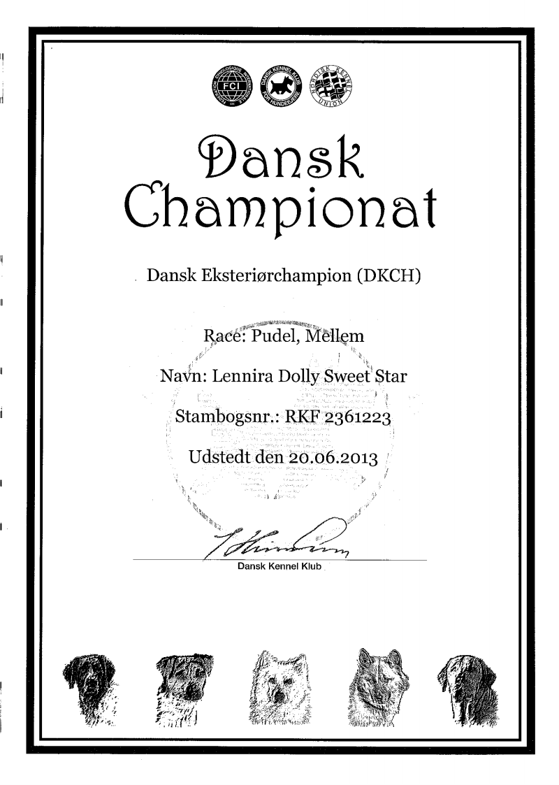 Lennira Dolly Sweet Star получила CACIB, ВОВ и СС на международной выставке в Дании. Таким образом, Долли получила чемпионский титул третьей страны в Скандинавии (чемпион Швеции, полученный в конкуренции с 19 черными суками, и Чемпион Финляндии, полученный на Finnish Winner), и закрыла титул Nordic Champion.