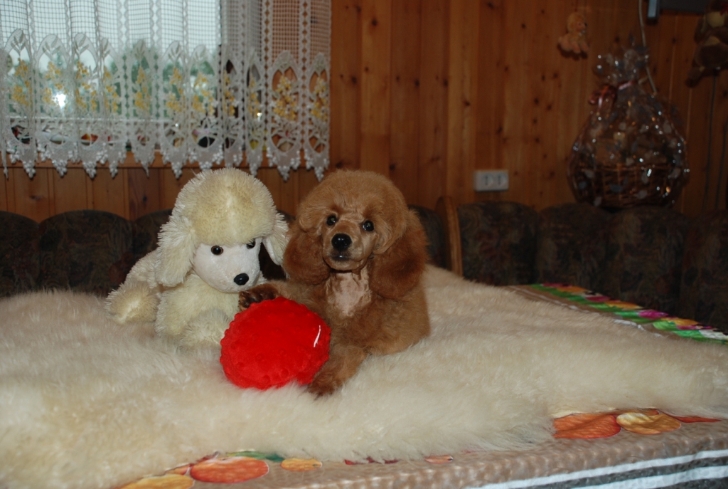 Мать: Ценная монетка из Розовых снов (29 см). На проходившей в апреле выставке она получила оценку отлично от лучшего эксперта по пуделям в мире - Лизабетт Мах (Швейцария).
