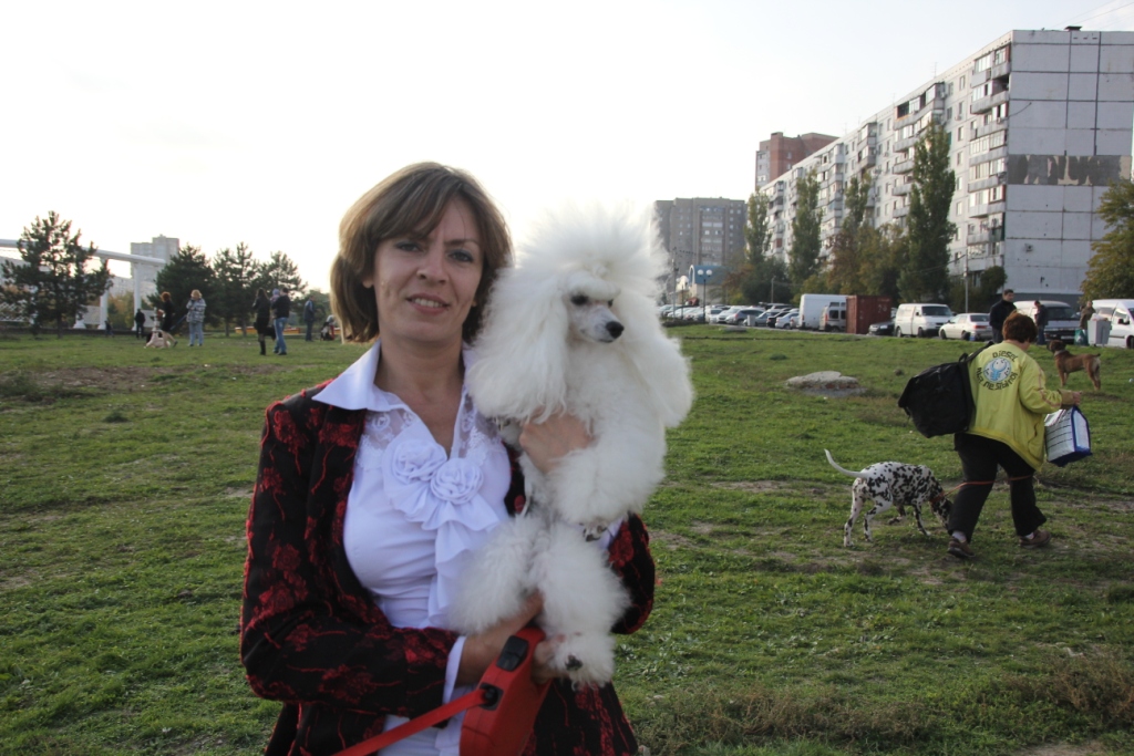 Приехали мы где-то в 5,00утра. Пошли погуляли, правда по асфальту, т.к. утренняя роса-враг номер один для маленьких пушистых собак. Место само по себе мне это очень нравится. Аквапарк "Осьминожек", рядом громадное площадь, ну что-то типа парка, только без деревьев- дорожки, лавочки и большие зеленые газоны, хоть прям пикник устраивай. Там мы и гуляли после рингов и фотографировались. Погуляв по приезду, мы пили кофе в теплом кафе, а Белка уютно устроившись у меня на ручках была центром внимания официанток. В 8,00 утра начали располагаться возле рингов. У Бель группа начиналась в 9,00, выход пуделей был около 10,00. Конечно для декорации не самое удобное расписание. Ведь собаку надо подготовить. К своему выходу, благодаря усилиям Ольги (заводчика), Белка была при полном параде. Но все-таки для Бель это мероприятие было серьезным испытанием, т.к. длительный переезд (около десяти часов), совсем небольшой отдых на месте и подготовка к рингу в громадном помещении где много народу и много собак (хотя мы и постарались клетками отделить себе определенное пространство и закрыть клетки одеялами, чтобы чужие морды не совались к нашим собакам), все это большая эмоциональная нагрузка на собаку. У меня бы и самой наверно голова закружилась от такой непонятной суматохи, если бы я попала на такое мероприятие первый раз. Эксперт Жук А. - конечно читала о нем в интернете. Собственно о чем читала, то и увидела. Прощупывает собаку от и до. Очень много внимания уделил форме головы и морды. Описывая Белочку на столе, подробно объяснял стажеру, показывая на собаке все достоинства и недостатки сложения. Не скажу что эксперт не обращает внимание на груминг, но возникло чувство, что это его не особо интересует по сравнению с тем как сложена собака и как она двигается. Белке для отличного показа немного не хватило драйва, но это и можно было предвидеть, учитывая большую эмоциональную нагрузку на собаку. Немного ниже обычного она несла хвостик. В остальном, мы с Бель показали все что смогли. Думаю для Белочки это было отличным дебютом в таком ранге выставки. Оценка отлично и R.CACIB, достаточно высокая оценка собаки (конечно мне как хендлеру хотелось бы большего)))), тем более под компетентным экспертом (хотя у каждого наверняка есть свои предпочтения и определенный взгляд на породу). Оставшееся время ожидания, мы с Белкой несколько раз ходили гулять и могу сказать что Белка вела себя достаточно свободно на прогулке, и не было заметно, что она в большом стрессе и ее что-то беспокоит, хотя меня этот вопрос как раз таки очень беспокоил. Потому что Белка достаточно нежное создание (и впервые без Наташи) и для таких собак нежелательно негативное восприятие посещаемого мероприятия. Когда я не была занята с другими своими подопечными, а у меня было еще две собаки, я конечно не могла устоять перед пронзительным Белкиным взглядом, и Бель перемещалась из переноски ко мне на колени. Вот тут она себя чувствовала кажется вообще как дома. И ее совсем не волновало происходящее вокруг. Многие посетители обращали внимание на Бель, подходили к нам и просили разрешение сфотографировать такую красоту. На обратной дороге Белка очень комфортно ехала у меня на коленях, на моей дорожной подушке, ей было так удобно, что не смогла я лишить ее этого комфорта, ну да мы люди предприимчивые и у меня про запас имела