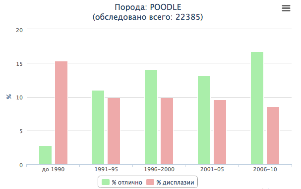 Как это работает: таблица содержит 168 пород собак и кошек. Можно просто листать её вперёд-назад стрелочками в правом нижнем углу. Можно сортировать по любому полю таблицы, нажав на заглавие соответствующей колонки. Например, увидеть породы, в которых самый высокий процент дисплазии, или самый низкий. Можно выбрать только некоторые породы или только одну, для этого в поле "search" в правом углу надо ввести название породы на английском, например "poodle". Если кликнуть на название породы (первое поле таблицы), то под таблицей будет выведен график изменения ситуации с ДТБС в этой конкретной породе. Например, вот так, как показано на вложенной картинке (внизу сообщения). Если кому-то что-то покажется интересным в таблице — буду рада! Я для себя немало интересного нашла... Например, то, что те породы, в которых вовремя спохватились и стали тестировать производителей, по прошествии трёх десятилетий ситуация значительно улучшилась. Но есть, увы, и такие, где всё катится дальше и дальше... просто потому, что когда взялись тестировать, было уже поздно. PS: Если что-то непонятно, дайте знать, исправим :) _______________________________________
