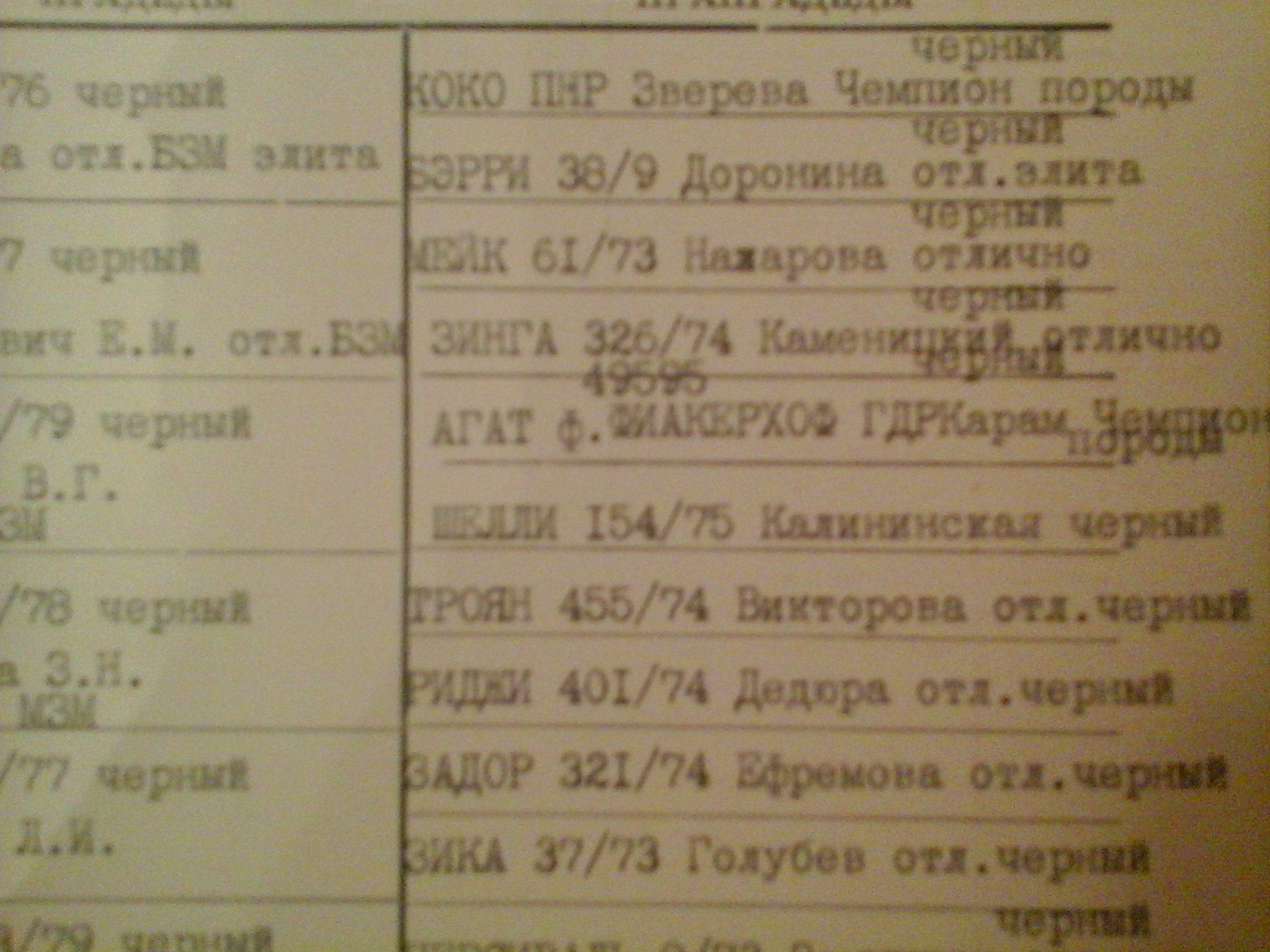 Сфотографировала родословную коричневого Марнарио 1989г.рожд. от моего черного Ульчи и черной Миканты, в родословной до 7 колена одни черные. В 4м колене есть Агат с правильным номером и правильным переводом клички на русский язык: