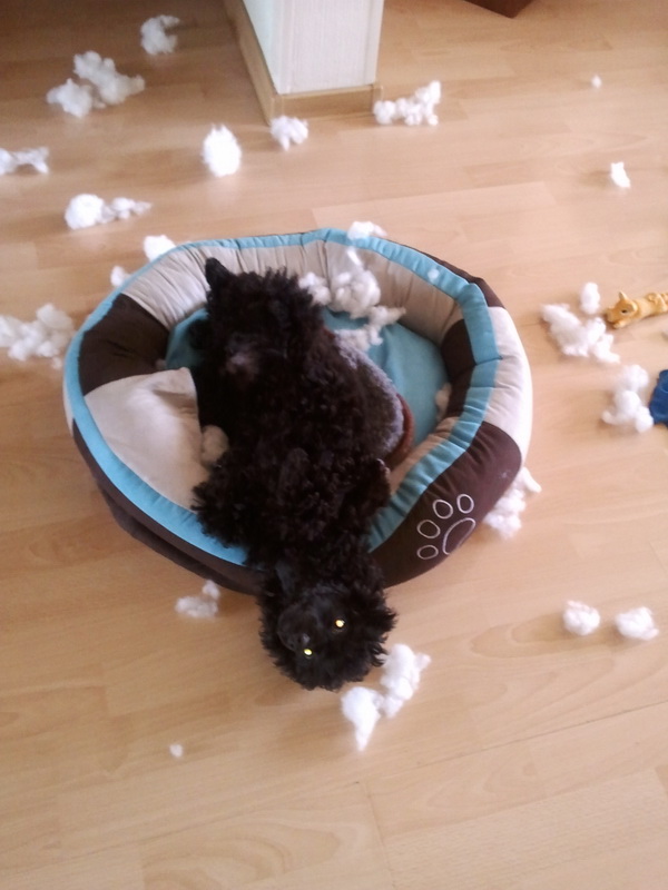 игрушки всегда по всей квартире разбросаны. Все равно найдет то перчатки, то тряпки из ванной утащит, тапки таскает. Одно время таскала губку из ванны. Утащит и половину съест. Хорошо, что я теперь знаю как рвоту вызвать, обошлось. На столах нельзя ручки, карандаши, флакончики оставить. Разодрала свой лежак. Два раза восстанавливал, молнию зашивал, чтоб не раскрывала и наполнитель не разбрасывала по комнате, а теперь чтобы реставрировать надо часа 3 потратить. Как-будто в наше отсутствие в собаку демон-разрушитель вселяется. При нас собака-ангел, прям заяц-заяц пушистый и белый. _______________________________________