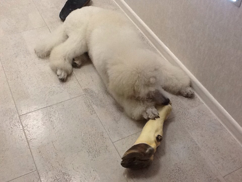 Половой вопрос у нас лет... 7 назад решился, положили полупрофессиональный линолеум. Прочности в нем достаточно... Мы год не могли на стыке положить порожик. 5 щенков большого пуделя не смогли отгрызть край. Считаю, это хороший тест.