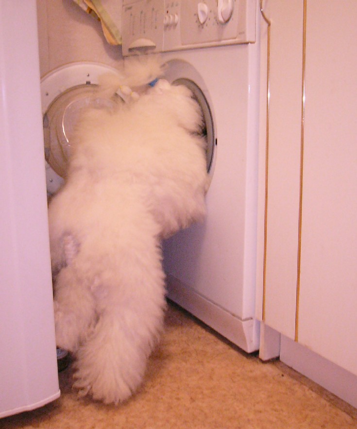 Однажды вечером одна белая любопытная пуделишка сделала большое открытие - она открыла стиральную машину (хотя до этого спокойно жила, три года не проявляя к ней никакого интереса). Вот что из этого получилось.