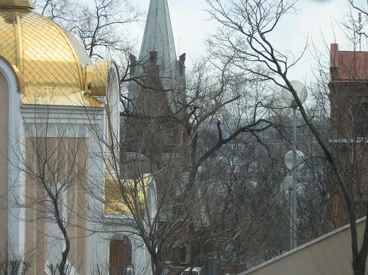 Православная часовня,а ниже немецкая кирха(просто красавица,исторический памятник).Кирху плохо видно,а жаль...