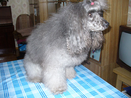 А я сегодня стригла малого серебристого пуделя. Ему 11 лет и он внук Дени Жино. Хозяин очень трепетно относиться к формам стрижки, стрижется собака 2 раза в год. Шерсть под резинку была оставлена по просьбе владельца.