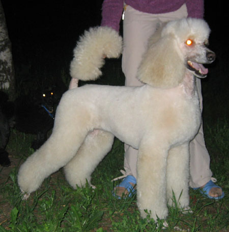 Вельдочка привет! А то, конечно есть. Мы окупировали лесок за домом и теперь там гуляют только пудели и мамы с колясками, лесок огорожен забором и там ЧИСТО. Ну а при виде ВСЕХ наших собаков баскервилей даже ротваков и ам.бульдогов уводят. Т.к. моя стая никого кроме пуделей и русского спаниелья Сэма не признает. Ну и вот список наших пуделечков: мои- Кеша(большой черный), Марфа(большая белая), Зями(черный карлик, заводила и "пахан") Юлины- Нюра(большая белая), Дуня(абр. тойка, скоро поедет в свою новую семью после полного выздоровления, и вообще той воспитанный большими это нечто!!!) и Ларик(большой абрикос, сын наш из последнего помета, приехал в гости на 2 недели, вот его только и смогли помыть и побрить) а так же Зямины детки с их владельцами. Ну и нас толпа. Спрашивается, кто сунется к нам? И вообще, это так красиво когда видишь много больших пуделей!!! _______________________________________