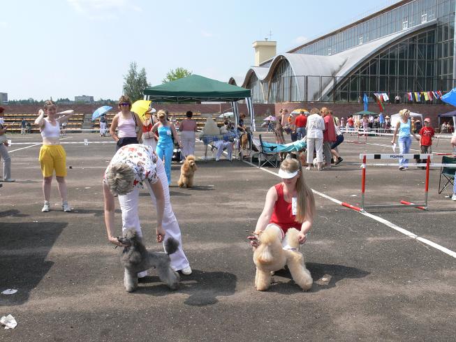 Ну что, начнем: Доехали до Минска на автобусе маленькой пуделиной группой: я с Никушей, Наташа с Глашуней и Ланкой, Ирина Подвысоцкая с абрикосовыми девочками: карликовой ELENSIS ESTEL и тойкой STILL RUSI OT KUTJUR HILDA Температура в Минске была аховая - до асфальта (точнее асфальтовая черная крошка) на стадионе, где проходила выставка - дотронуться было невозможно. Температура на солнце - 51* благо - взяли с собой шатер и спрятались от этого солнцепека, чуть позже к нам присоединились Татьяна Королева и ее знакомые. Долго ждали пока пройдут мопсы, которых было просто невероятное количество, ринг задержался почи на 1,5 часа. И наконец-то пудели начали выходить в ринг - вот тут началось самое страшное: это был не асфальт, а раскаленная сковородка, а эксперт, как-будто нарочно, затягивал экспертизу, наблюдая как пудели задирают лапы в стойке и скачут при движении. Особенно долго проходили сравнительные ринги - эксперт проверял собак и их хозяев на прочность - кто дольше выдержит. Но, пройдя эту экзекуцию, все наши девочки заслуженно получили свои титулы: Ника - CAC, CACIB, Чемпион Белоруссии, ВОВ Дольче Вита из ЧБК - CAC, CACIB, Чемпион Белоруссии, BOS Вива Виктория из ЧБК - ЮСАС, Лучший юниор, Юный Чемпион Белоруссии Наташа и Надежда - от всей души поздравляю Вас с прекрасными результатами ваших девчонок. Наташа - с закрытием Интера В том числе мои поздравления Надежде и Галине Алексеевой с маленькой Масяней SLAVJANKA CHERNAYA ZHEMCHUZHINA SEXTRY - CAC, CACIB, Чемпион Белоруссии, ВОВ Надежда, а тебя еще и с великолепным результатом JUTANA ALDARON - CAC, CACIB, Чемпион Белоруссии, ВОВ Мне кажется он единственный стоял как вкопанный в ринге. карликовая абрикосовая ELENSIS ESTEL - CAC, CACIB, Чемпион Белоруссии, ВОВ той абрикосовая STILL RUSI OT KUTJUR HILDA - CAC, Чемпион Белоруссии Ирины Подвысоцкой Иринка! Поздравляю тебя также с закрытием Эстель интерчемпиона и получением чемпиона Белоруссии малышкой Хильдой. Но самое интересное началось в бестах: 4 место в расстановке в Бесте юниоров стала Вива Виктория из ЧБК - прекрасный результат, если учесть количество претендентов. в 9 группе - из более 20 собак в первом отборе были оставлены пудели всех разновидностей, бишон и к сожалению не помню породу, кажется мопс. После дополнительного осмотра эксперт оставила в ринге пятерых: 1 место - великолепный белый большой KOROL LYUDOVIK ZIRKA ANTARES 2 место - Бишон , 3 место - JUTANA ALDARON 4 место - мопс 5 место - Ника (NIKOL` SUNNY GIRL) сравнение на ВОВ карликов современного окраса SOIGNES ROMEO - BOS CAC CACIB Чемпион белоруссии ELENSIS ESTEL - ВОВ
