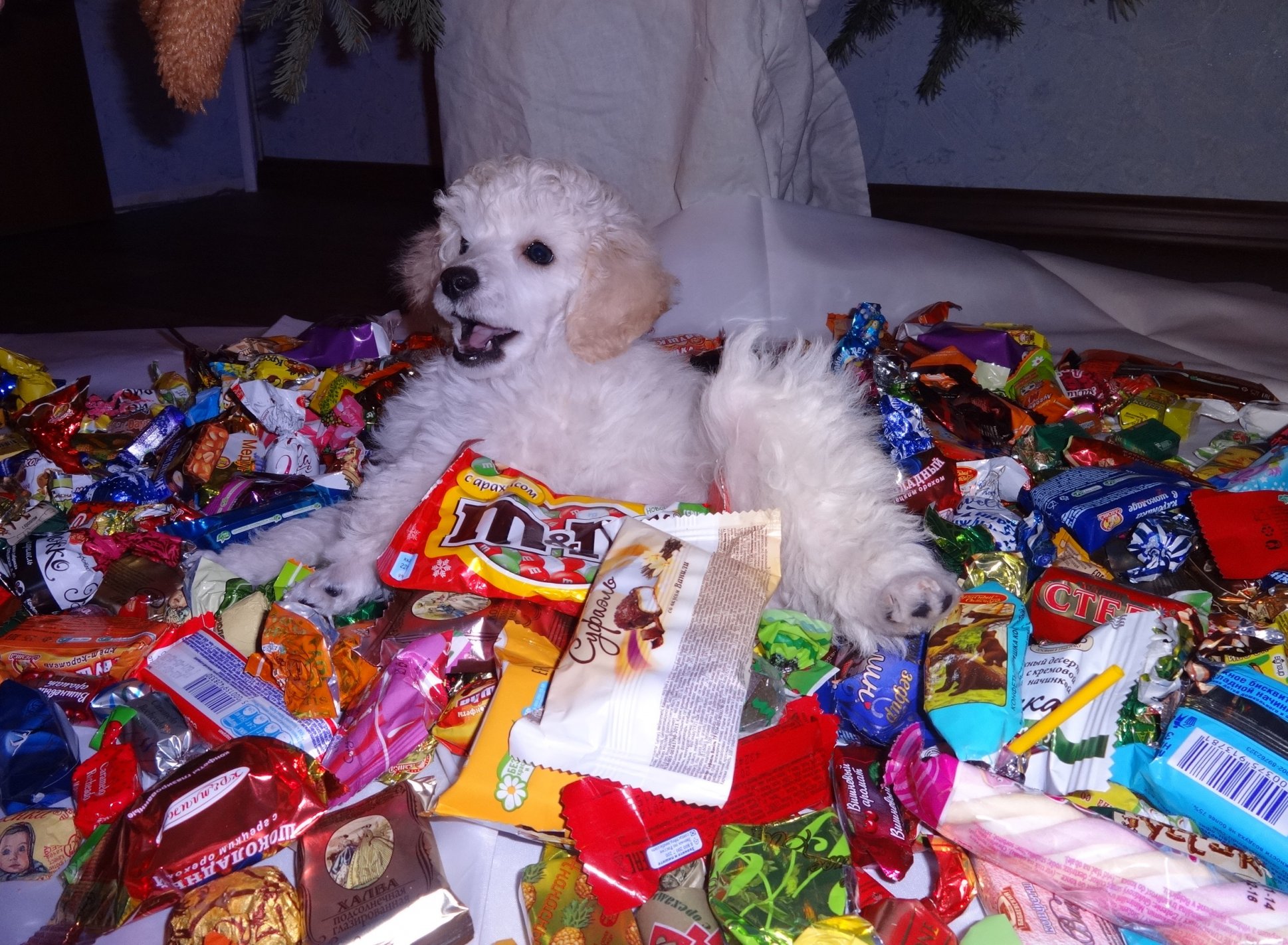P.S. История такая. Уложили Дэни спать, пошли фотографировать детей в конфетах. Ну как он мог пропустить такое событие. Что-то без него. Проснулся, пришел, понаблюдал из далека. Как только девочки встали, лег на теплое место и все нюхал. Попробовать даже не пытался и мы, конечно, не кормили. Просто, столько разных запахов. Ему было очень интересно. Мы его тоже сфотографировали и все быстро убрали, подальше.