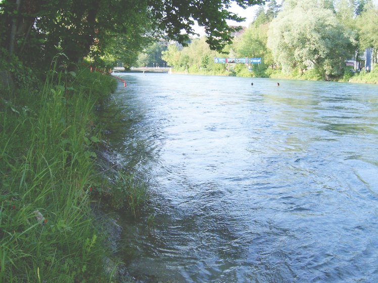 Река в Берне, Ааре называется. Она изумрудного цвета и очень быстрая. Это не мешает в ней купаться, причём нужно прыгнуть в стремнину, и она тебя несёт. Чтобы из неё через километр вылезти, нужно умудриться ухватиться за красную ручку слева:)