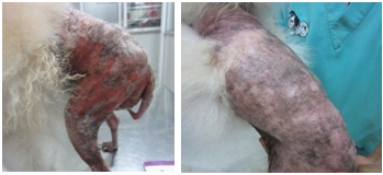Вот нашла ещё пример. Как я понимаю, это довольно запущенный случай на момент обращения и в процессе поддерживающей терапии. Фото собаки и снимки с микроскопа. Оригинал здесь: http://pdhbvet.com/sebaceous-adenitis-pada-anjing-pom/ (с индонезийским у меня не очень, перевести не могу - там статья вета с обсуждением диагностики и лечения этого конкретного случая)
