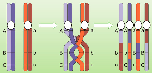 Татьяна, когда формируются половые клетки, генетическая информация на хромосоме смешивается. То есть, на одной полоске-хромосоме присутствуют отрезки, наследуемые от бабушки и от дедушки. Причём, смешиваются они не хаотически, а именно отрезками. Вот как на первой картинке.