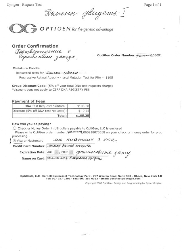 Kogda krov' poluchena OptiGenom, oni prisylajut podtverzhdenie na e-mail, kotoryj vy ukazali, kogda zapolniali formu. Sample Receipt Notification The Blood sample for your dog (KLICHKA SOBAKI) from order( FAMILIJA)_ (NOMER ZAKAZA) was received at Optigen today. Turnaround time is approximately 2 weeks, depending on workload. Thank you! The Staff at Optigen OptiGen, LLC Cornell Business & Technology Park 767 Warren Road, Suite 300, Ithaca, New York 14850 Tel: 607 257 0301 Fax: 607 257 0353 Ne ubiraetsia nikak fail, v niom to ze samoe, chto ja skopirovala iz pis'ma. Vam ostajotsia tol'ko poluchit' otvet, kotoryj vam pridiot po e-mailu ili pochtoj, zavisit ot togo, chto vy ukazali pri zapolnenii ankety. Variant dolzhen byt' tol'ko odin, ili-ili. Na etom vsio. Последний раз редактировалось Galka1; 27.09.2006 в 18:16. |