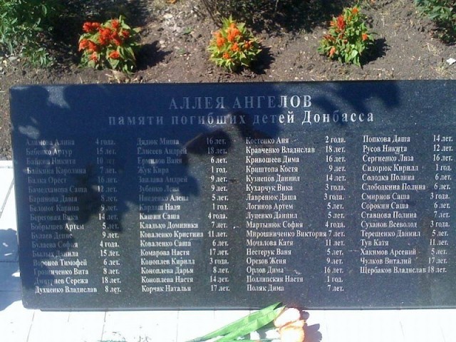 В Донецке установлен памятник погибшим детям - 66 имен (в возрасте от 6 месяцев до 18 лет), изготовленный кузнецом В. Михиным. Все розы выкованы из гильз снарядов.