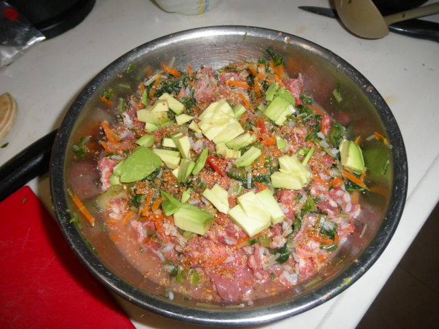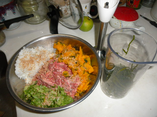 Из соковыжималки: морковь, яблоко, спаржа, зелёный сладкий перец, 1 апельсин. Добавила помидор на тёрке, морской капусты, чуть риса. Смешала с мясом (вот в таком виде у нас продают мясо для собак. Редкость конечно, но бывает. ) _______________________________________