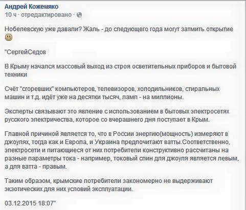 Украинский блогер: взрывы в херсонской степи эффектно убрали Украину с крымского энергорынка «То есть, что произошло? Радикально настроенных товарищей ловко отправили в глухие херсонские степи, чтобы они взрывали там, а не на Банковой. И взрывали то, что скоро не будет нужно. По сути — металлолом. Но за это откроют дела по статье «терроризм» и посадят очередных патриотов на крючок. Херсонский эпизод в биографии блокировщикам Крыма могут припоминать и через десять лет, по надобности. Радикалы должны быть под контролем, под статьей» а вот с этим полностью согласна,про деньги(оттуда же): «Раньше мы продавали Крыму электроэнергию, а скоро будем закупать ее через Крым. Раньше мы получали деньги от оккупанта, а скоро будем отдавать деньги оккупанту. Как и на Донбассе, за уголь.» и с этим: «Да, совсем забыл одну важную вещь. После подрыва электроопор жители полуострова не станут относиться к Украине лучше. Сейчас им объяснят, что фашисты оставили больницы и детсады без света, а в декабре Путин-спаситель на белом коне приедет в Крым и торжественно перережет ленточку, открывая энергомост» _______________________________________