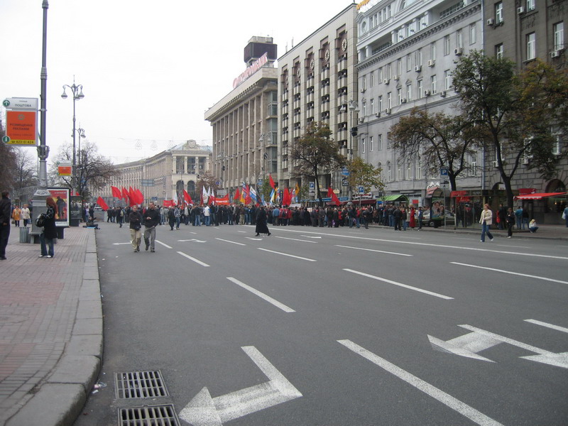 далее, тоже Крещатик, но с другой стороны. Это одна из многих демонстраций во время празднования 14 октября годовщины основания Украинской повстанческой армии (УПА). Вдали видны коммунисты, выступающие против проведения шествия ветеранов УПА.