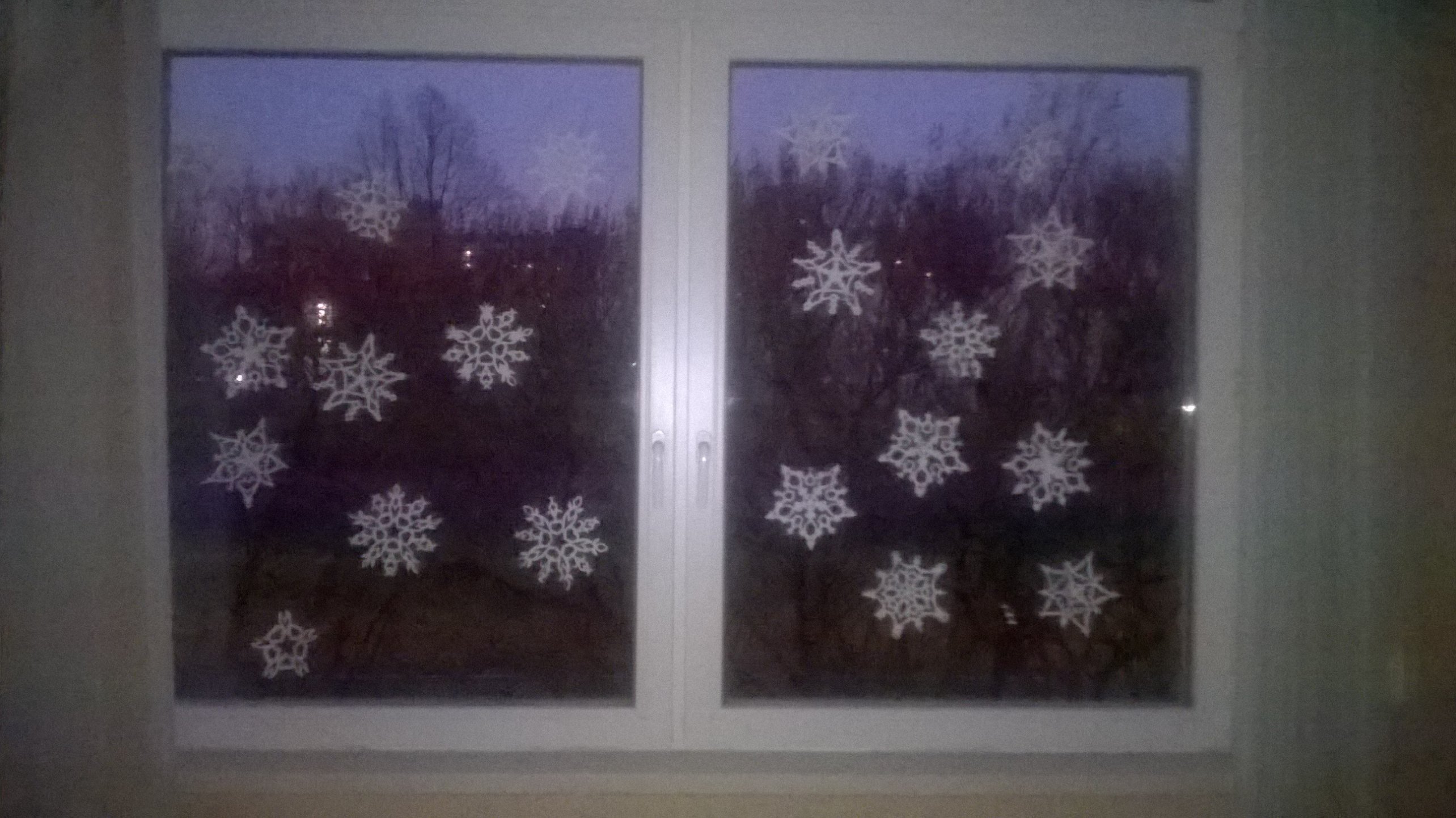 Три окна таких. А четвертое - в актовом зале. Больше 60снежинок. Вырезали дети.