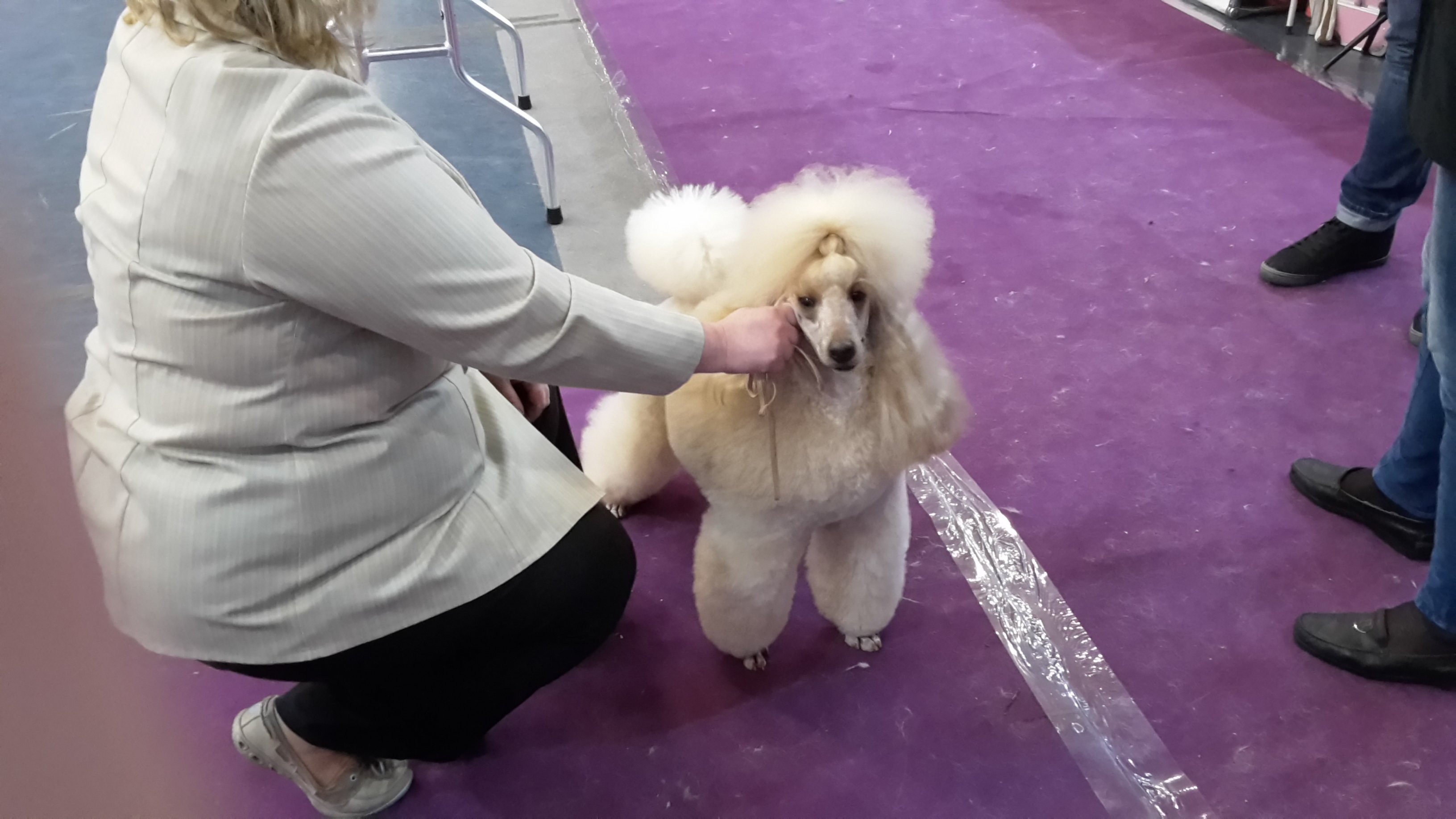 Спасибо ей огромное!! На оценочном столе Сула, конечно, радостно облизала судью Мы никак не можем не облизать))Судья сказала "до встречи в чемпионах")) Видимо, Сула ей очень понравилась) ![]() Правда, конкуренции не было, мы в своем размере были единственные, но все равно приятно :) ![]() А вот это Сула в бэсте: прямо перед ней стоит победитель, абрикосовый пуделек) ![]() ![]() Ну и наш маленький кубочек с розеткой: