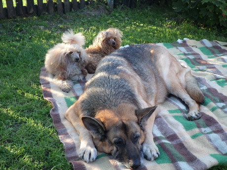 А у нас вот такая славная компания.И,слава богу,все хорошо.овчарка пасет мелочь,мелочь со своей стороны,что хочет со старушкой то и делает.Мелкие собаки пришли в дом к уже существующей овчарке.