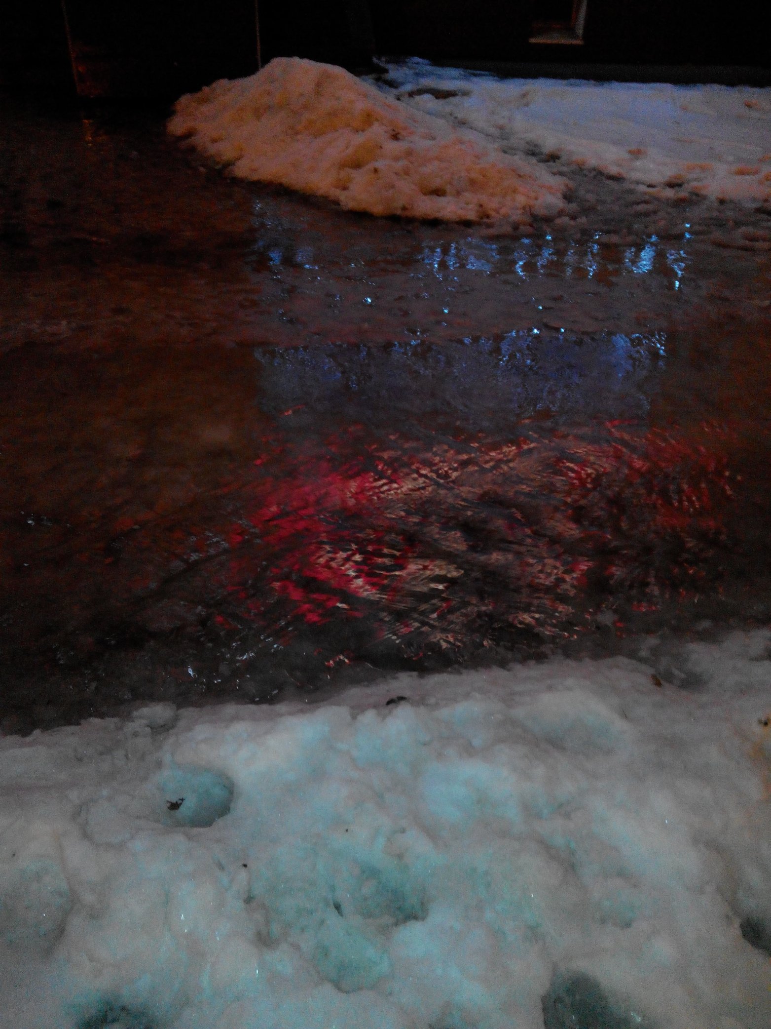 Вчера вечером гуляла в резиновых сапогах... Шел достаточно приличный дождь при +5. Вначале от снега под водой образовался каток ледяной, а потом немного рыхлый стал.... Фотки с мобильного...