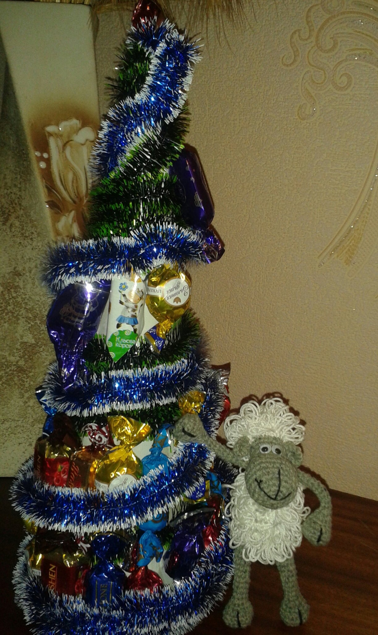 Патти, нам тоже такого плана елочку дарили только в прошлом году......я тогда к ней овечку свою связанную пристроили и сфоткала на память пока конфеты были ещё не все сьедены.......но основа просто конус был картон,т.к. дарилась ёлочка ребёнку )))))