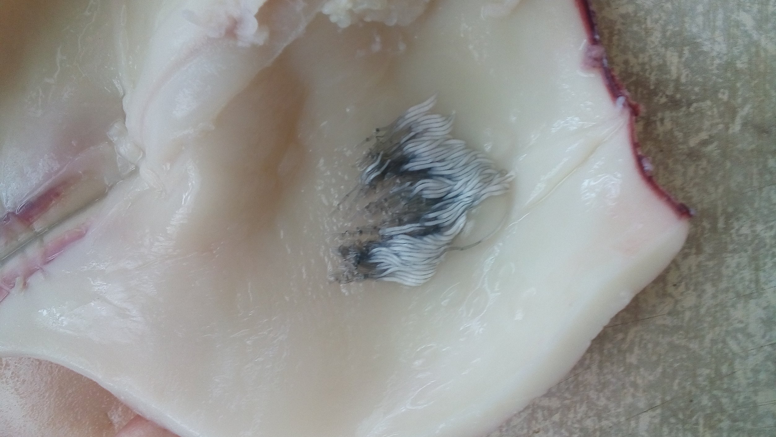 Сегодня решила кальмарчиков приготовить. А внутри одного оказалась икра и вот такая странная штука. Я не знаю, что это. На всякий случай кальмарину выбросила...