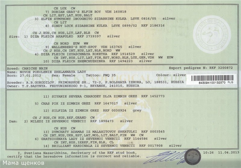 бабушка щенков по маме Гранд Чемпион России-Миледи из Северной Венеции, надо поставить ребята Вам родословные родителей