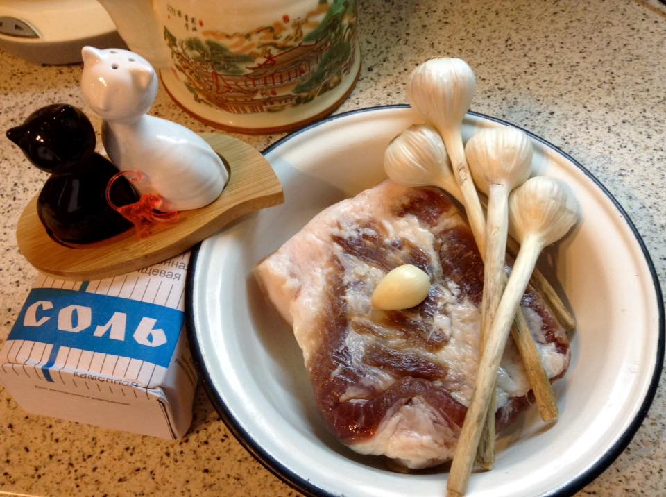 А у нас первые приготовления к Елочке. На этот раз главДМ угодила и подобрала Снегурочку, которая любит сало (надеюсь, что это не конфиденциальная информация). Чеснок для красоты, маленький зубчик порезала. А вот соль оказалась кирпичом.