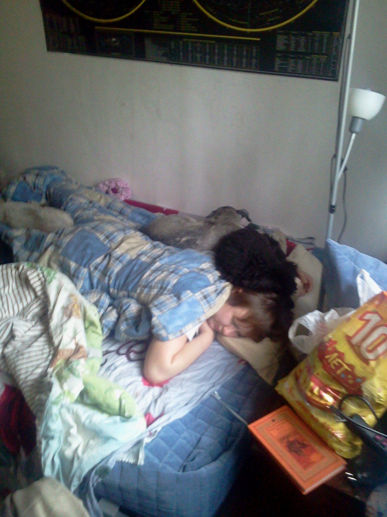 А днем, стоит прилечь, тут же оказываешься "в пуделях". Фрея бесцеремонно ложится прямо на засыпающего, а Шагане устраивается под боком. Тишка, наш первый пудель, маленький был, и спал с нами, в ногах. Да и, к тому же, он был коротко стриженный, и опять же, маленький, и мыть и сушить его было гораздо легче, чем двух наших лошадок. |